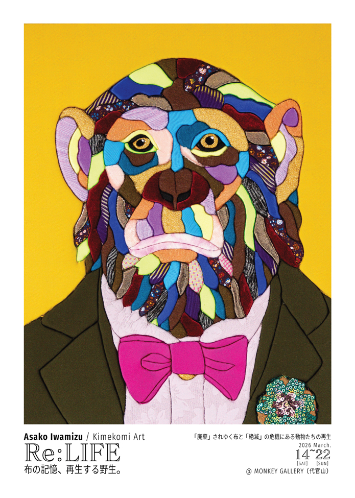 テーマは「絶滅危惧種の動物たち」です。 私が世界中で収集した ヴィンテージファブリックに加え、 私の地元・福岡が誇る伝統織物 「小倉織(こくらおり)」や 「久留米絣(くるめがすり)」を 使用します。 「廃棄」されゆく布と、 「絶滅」の危機にある動物たち。 それらを重ね合わせ、 日本の伝統技法「木目込み」を用いて 現代アートとして再生(Re:LIFE)させます。 代官山の空間に、 ファッショナブルで力強い動物たちが 現れる展示構成を予定しております。 <ワークショップ開催> 作家本人によるワークショップを開催いたします。 針や糸を使 わずに布を「木目込む」 安全で創造的な手法は、 多くの子どもたちや大人まで楽しんでいただけます。 世界中のテキスタイルに触れ、 あなただけの「再生の物語」を形にしてみませんか。 内容: 作家による直接指導。 世界中の布から好きなものを選び、 作品を制作します。 定員:各回6名ほど 参加費:4,400円(税込) 3月14日(土) 14:00~16:00の回 3月15日(日) 10:30~12:30の回 14:00~16:00の回 予約方法は後日掲載いたします。 <artist> ![]() イワミズアサコ ファブリックジョッキー / アーティスト 北九州を拠点に、 日本の伝統工芸「木目込み」を 現代アートへ昇華させた 独自の「キメコミアート」を展開する。 ファッションデザイナーの経験を活かし、 世界中から収集した古布や廃材を、 接着剤を使わず直感的にリミックスする手法で制作。 イタリアの至宝「ルイジ・ベヴィラックア」との協業や ロンドンでの個展など、 国境を超えて「再生と循環」の物語を紡いでいる。 オフィシャルサイト |